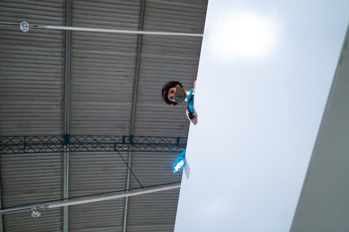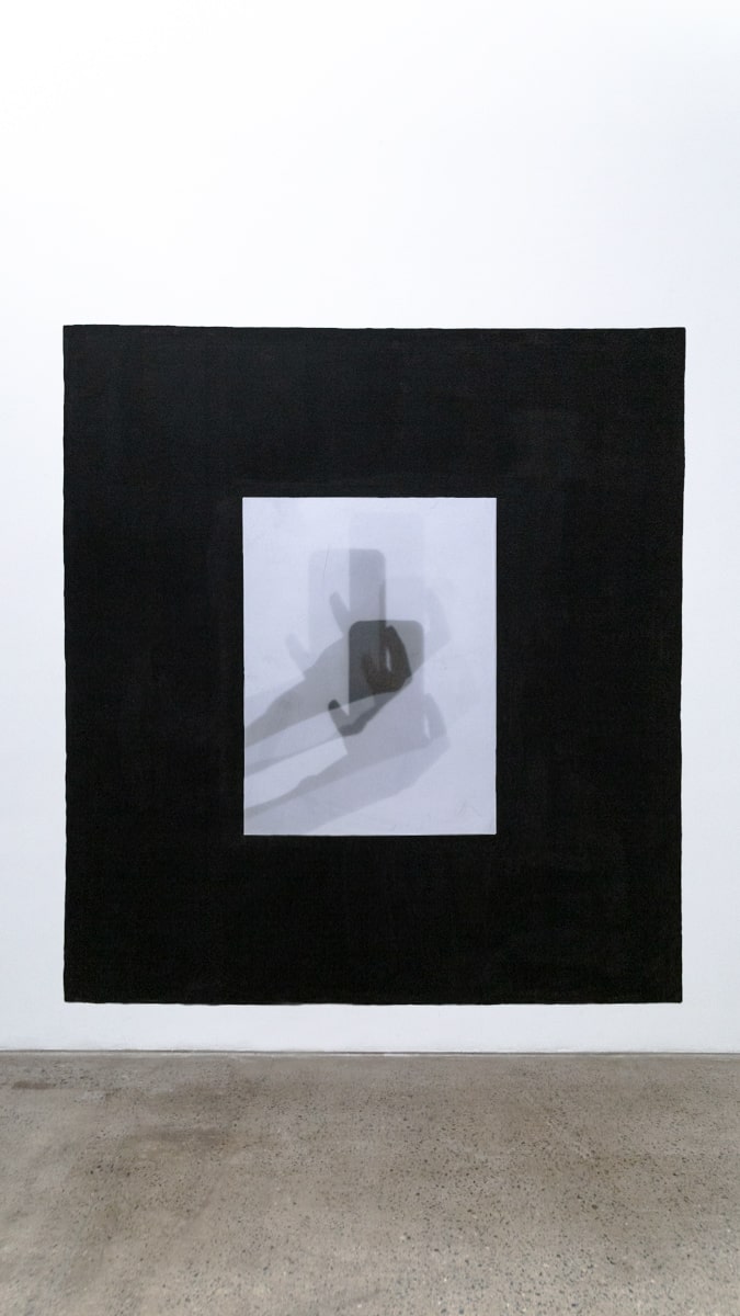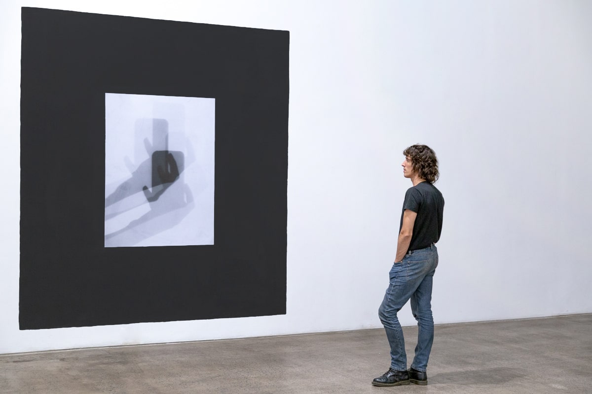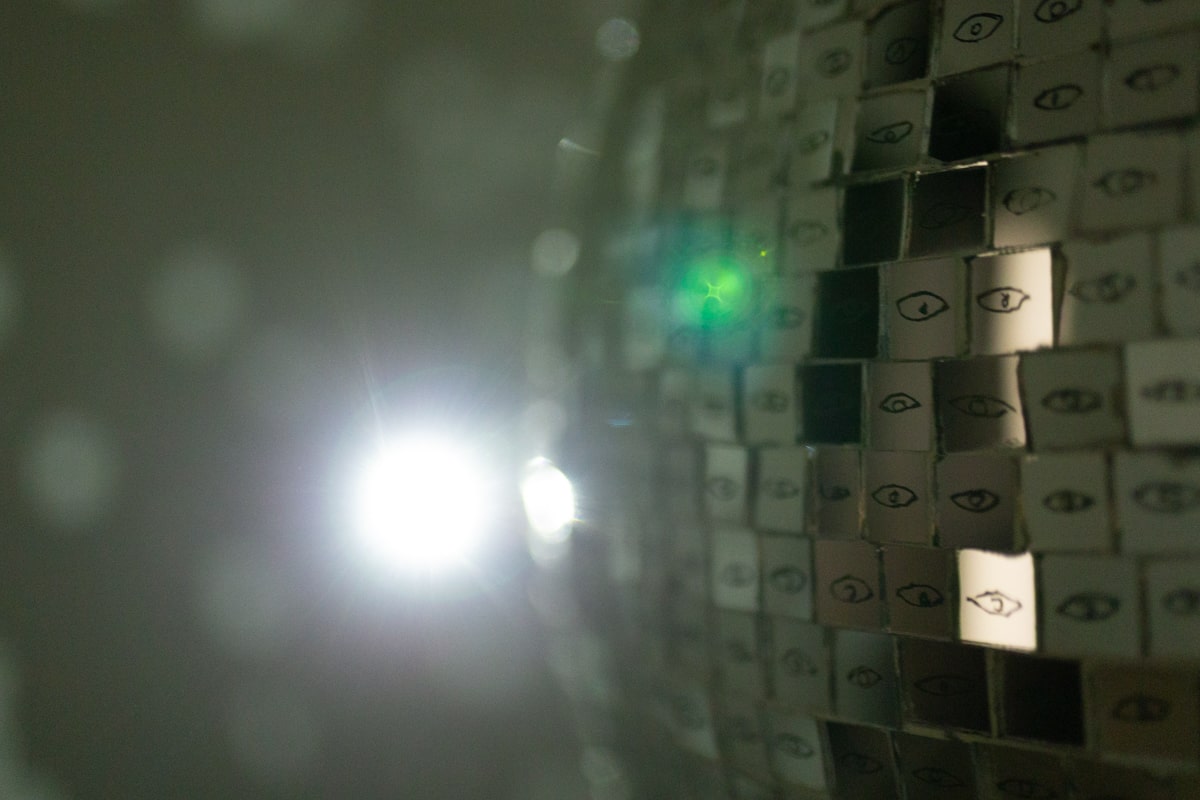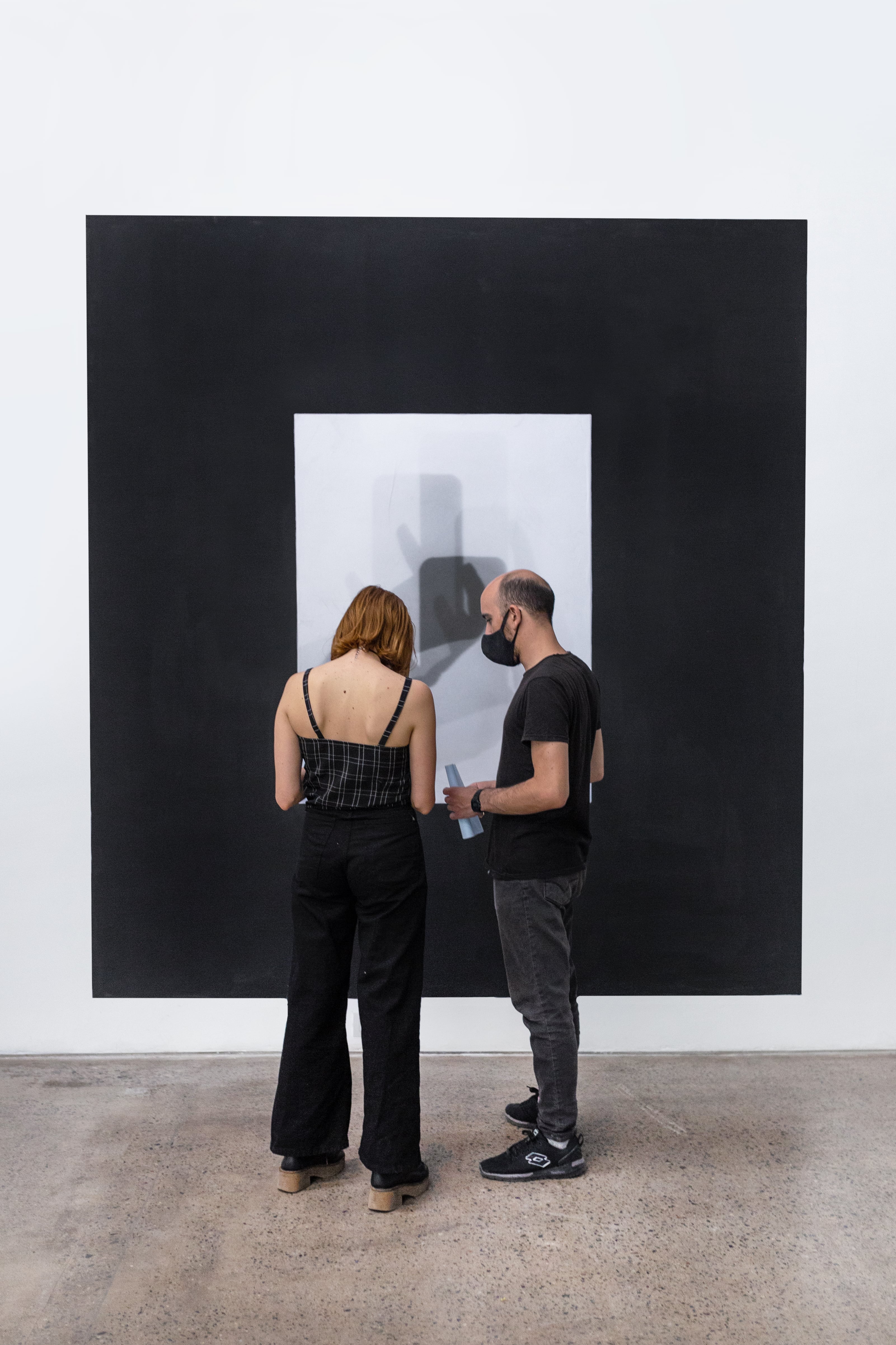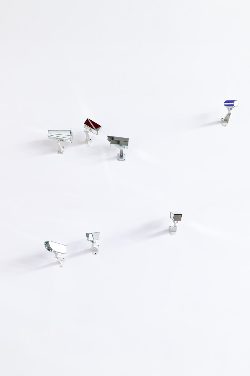 As a counterpoint, immediately after the portraits, the shadow of a hand is observed. Printed in grayscale on poster paper and glued to the wall, the austerity of this piece's montage acts as a reminder of the previous gesture. The shadow is a counter-reflection with a bad reputation, but here a single image is enough to remind us that it is ephemeral and personal, as atavistic as it is elusive. On another wall, however, a multitude of surveillance cameras constructed from mirrors buzz like insects. "Diminished Reality" (2018) was first exhibited with the intention of referring to paranoia and social control. In this new context, and with a montage that dilutes the functions they allude to, the cameras finally open up to paradox. A tech sky with flying insects hovering over a narcissistic, quarantined society. Each shiny bug stares back at us, appearance exiled from significance.