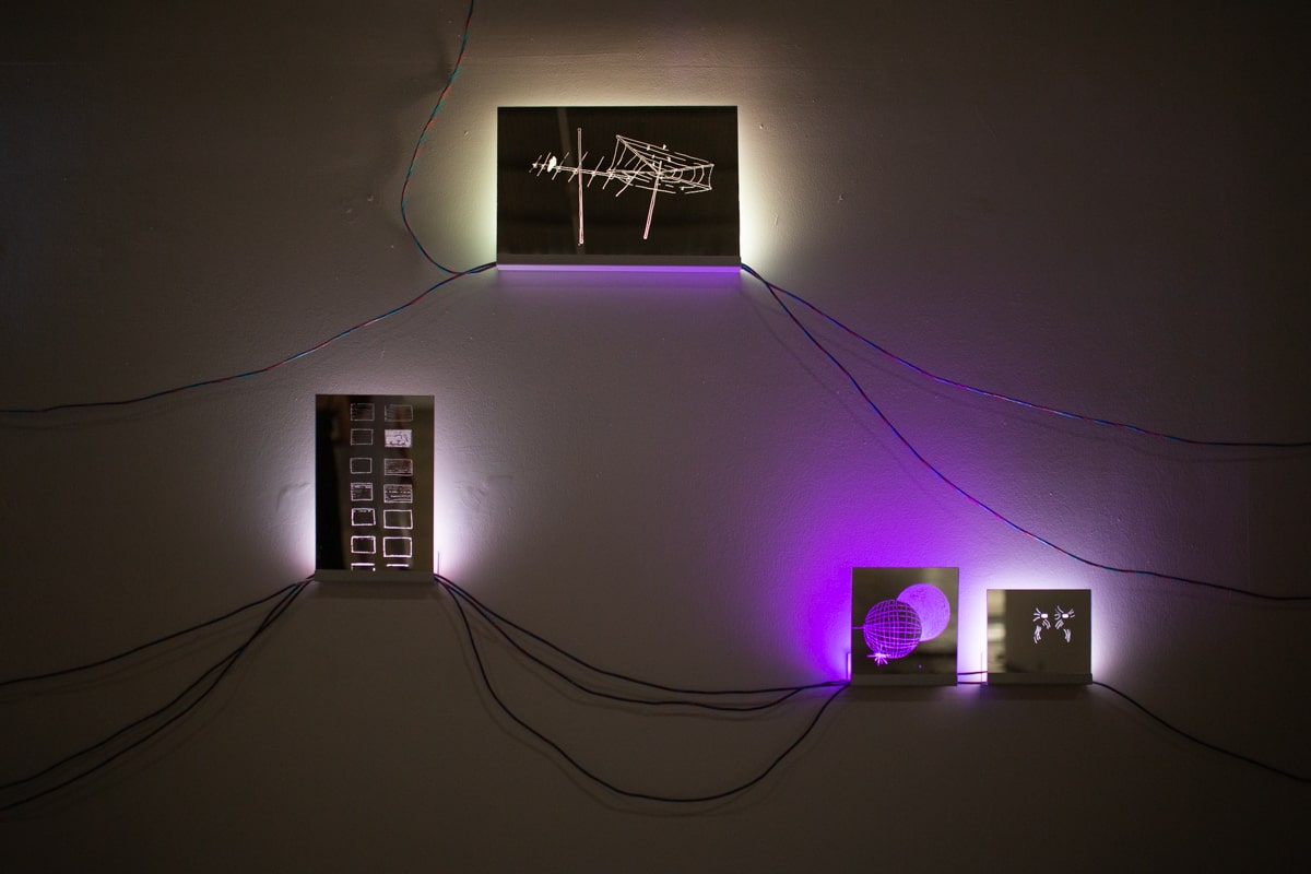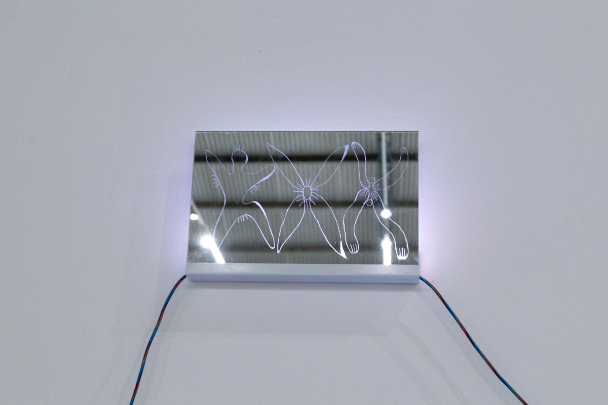 Continuing with her previous works, this exhibition concentrates Nina's explorations with mirrored material and encourages a conceptual shift that leans toward the symbolic. "Apple Lung" (2020) embodies the screen-window analogy so central to our times. Looking out from her balcony each night, she witnessed the sequence of lights in the windows of her neighborhood's neighbors, their colors and scenes. However, what she recovers from that vision is color temperature and a deviant idea about the horizon. Like portals, each drawing, joined to a larger ensemble, constructs a dynamic symbolic landscape.